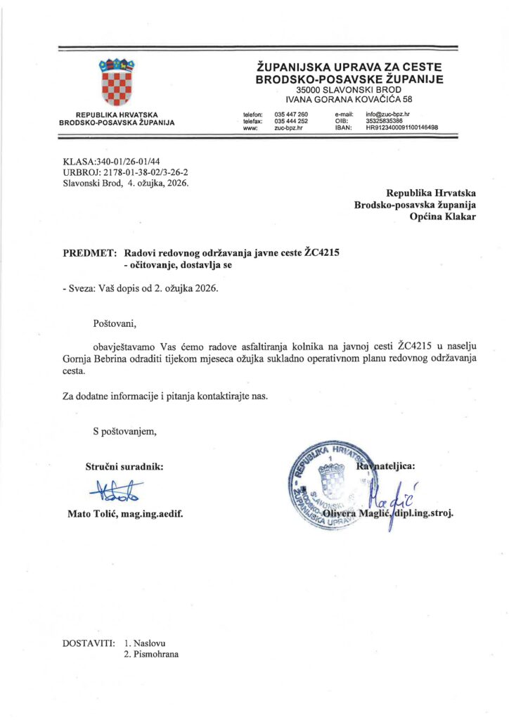 Obavještavamo javnost kako smo nadležnoj službi uputili službeni upit vezano uz nastavak radova na asfaltiranju kolnika na županijskoj cesti ŽC4215, na dionici Ruščica – Klakar – Donja Bebrina, u naselju Gornja Bebrina.