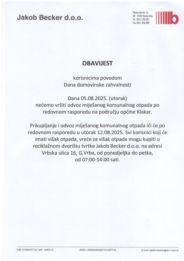 Dana 5.8.2025. (utorak) Dan domovinske zahvalnosti, tvrtka Jakob Becker d.o.o. neće vršiti odvoz miješanog komunalnog otpada po redovnom rasporedu na području općine Klakar.